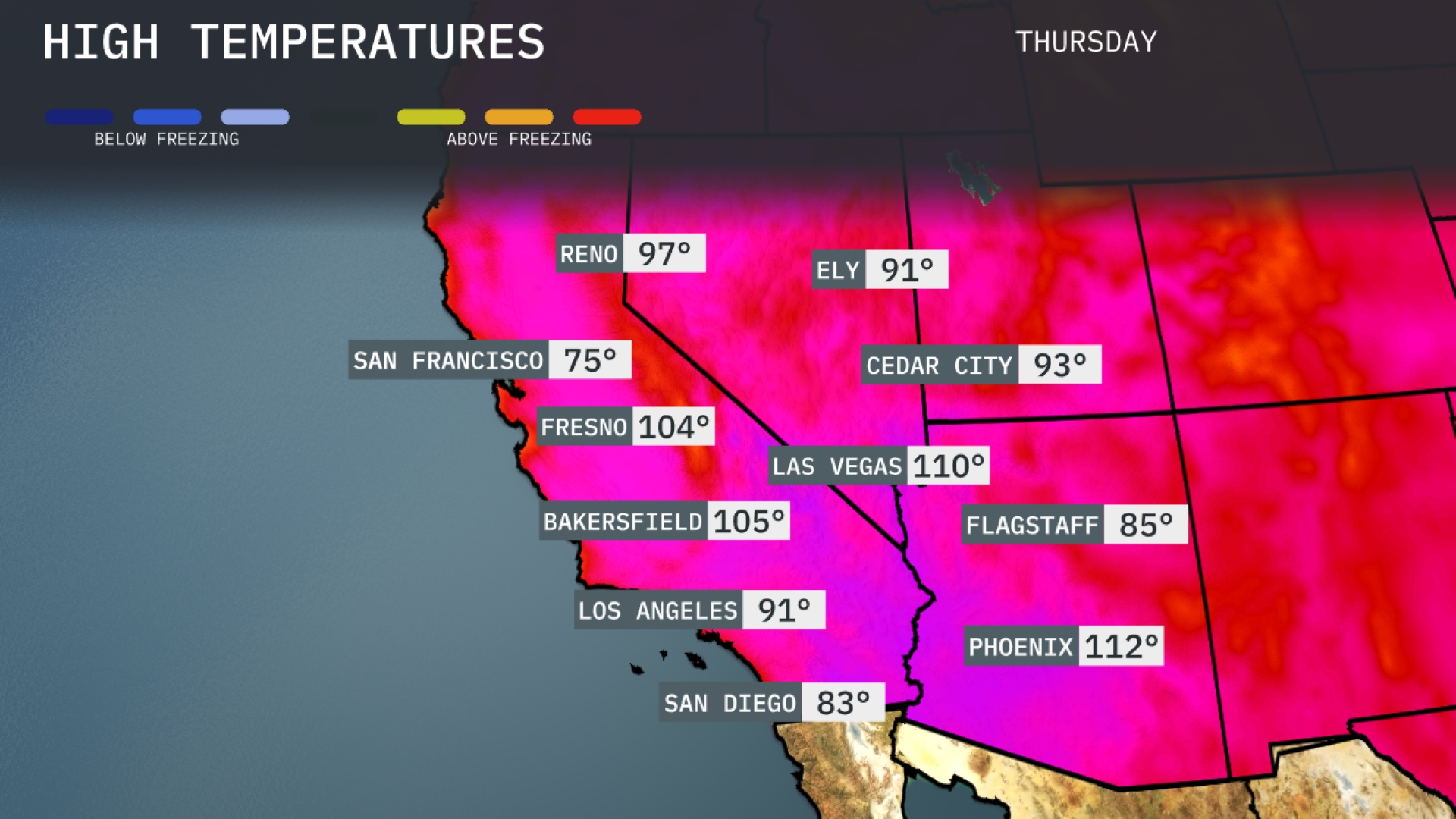 Tomorrow, Phoenix will experience scorching heat with a high of 112 degrees, making it one of the warmest spots in the region. Las Vegas is set to reach 110 degrees, also reflecting above-average temperatures for this time of year. Meanwhile, Bakersfield and Fresno will be uncomfortably warm, with highs of 105 and 104 degrees, respectively. San Diego will enjoy a milder day at 83 degrees, while Los Angeles is expected to hit 91 degrees. The persistent high-pressure system continues to dominate the Southwest, pushing those temperatures even higher.