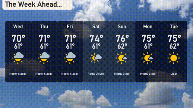 Wednesday: Mostly cloudy with a high of 70 degrees and a low of 61 degrees.