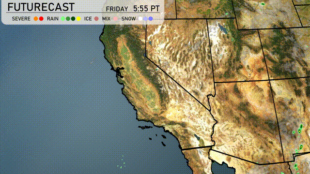 The Southwest region is currently experiencing a variety of weather conditions. Rain is sweeping along the California coastline, benefiting areas like San Francisco and Los Angeles with relief from dry conditions. Fresno and Bakersfield are under clear skies, while Cedar City and Ely might see some light snow mixed with rain. Las Vegas and Phoenix remain dry, with clear skies prevailing across the deserts.