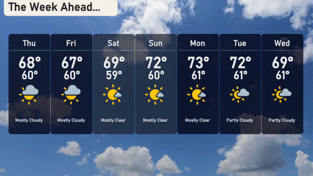Thursday: Mostly cloudy skies with a high of 68 degrees and a low of 60 degrees.