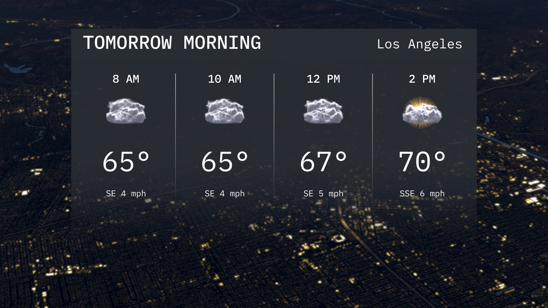 In Los Angeles, you’ll begin your morning with a mild 65 degrees at 8 AM, maintaining a cloudy sky and a southeast breeze. By 10 AM, the temperature stays consistent at 65 degrees with similar conditions. Expect slight warming as clouds linger through noon, reaching 67 degrees with winds picking up slightly from the southeast.