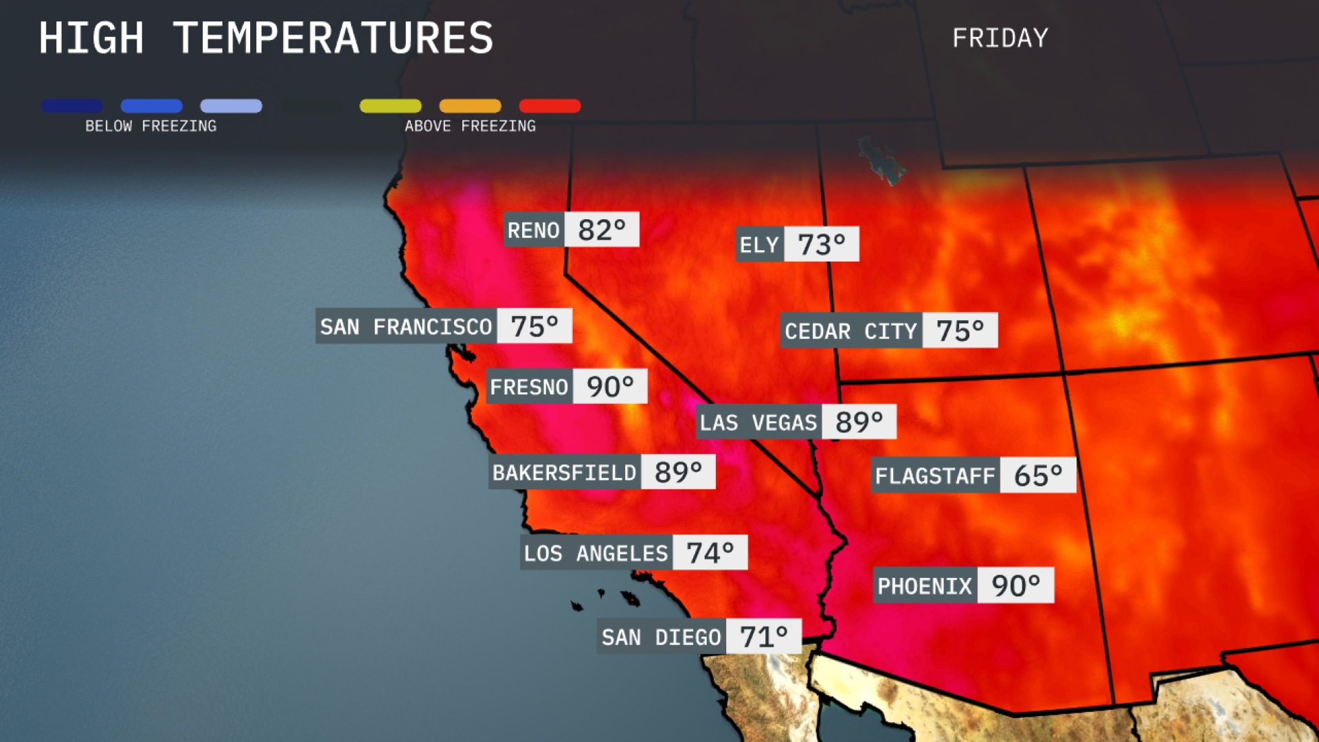Tomorrow Bakersfield will warm up to a high of 89 degrees, while Fresno will reach a hot 90 degrees, making it one of the warmer spots in the region. Las Vegas is expected to see a high of 89 degrees, contributing to a stretch of above-average temperatures. In contrast, San Diego will experience a cooler 71 degrees and Los Angeles will reach 74. Over in Phoenix, temperatures will soar to 90 degrees, consistent with the ongoing warm trend across the Southwest. Flagstaff will be the cooler outlier, with a high of just 65 degrees.