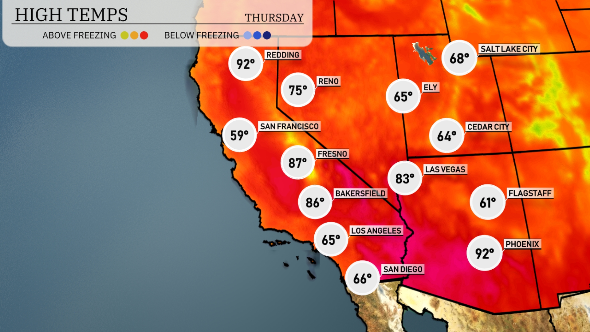 Tomorrow, the Southwest will experience notably warm temperatures, well above average for this time of year. Phoenix is forecasted to reach a sizzling 92 degrees, while nearby Las Vegas will see a high of 83 degrees. In California, Bakersfield will enjoy 86 degrees, and Fresno is set to hit 87 degrees. Coastal areas will have milder temperatures, with San Diego reaching 66 degrees and Los Angeles slightly cooler at 65 degrees.
