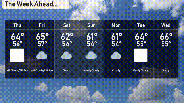 Thursday: Cool with some sunshine, expect highs around 64 degrees and a nighttime low of 56 degrees.