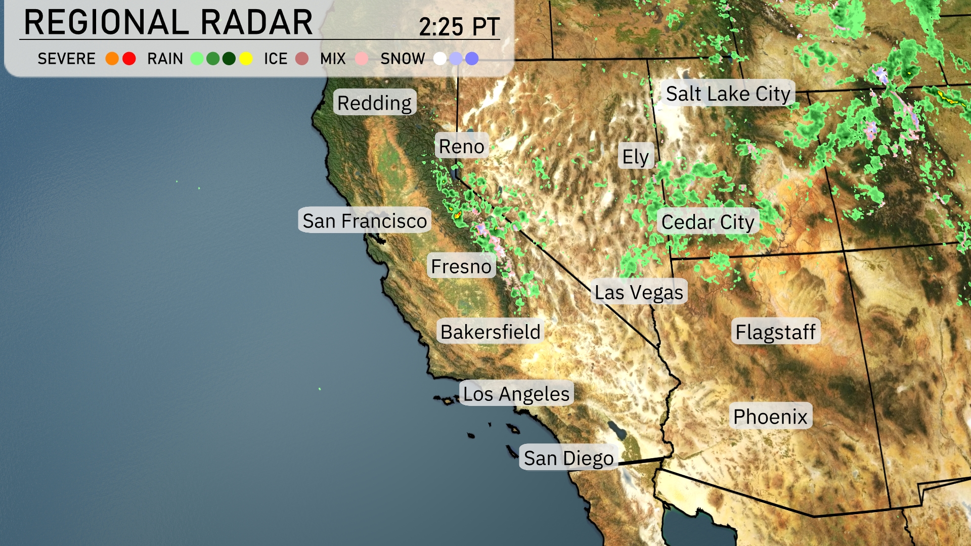 The radar shows scattered rain showers across parts of northern Nevada and Utah, with Ely and Cedar City seeing intermittent rain. Light showers extend into southern Idaho near Salt Lake City but remain patchy. Coastal areas like San Francisco and Los Angeles are enjoying dry conditions. Meanwhile, Reno and Fresno are under partly cloudy skies with no significant precipitation. The Southwest, including Phoenix and Las Vegas, remains predominantly clear.