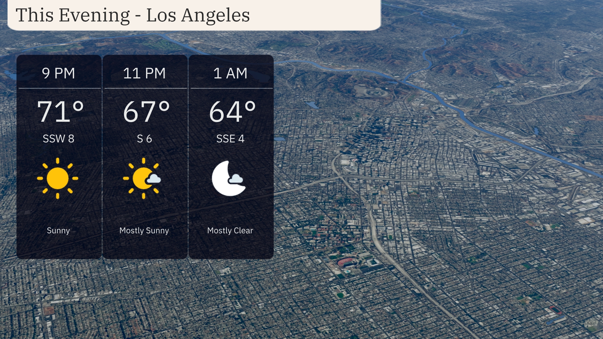 Sunny skies continue in Los Angeles this evening, with temperatures starting at 71 degrees at 9 PM. As the evening progresses, expect mostly clear conditions with temperatures dropping to 64 degrees by 1 AM. Winds shift slightly, moving from SSW at 8 mph to SSE at 4 mph. Beautiful clear skies and gentle breezes make for a pleasant night.