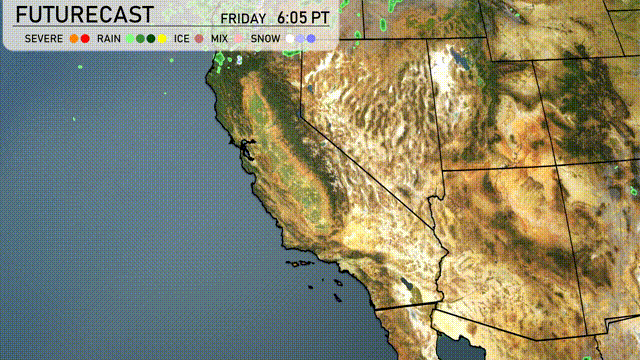 On the Regional Radar, a system of clouds and rain is affecting parts of Arizona and Nevada. Flagstaff and Las Vegas are under rain showers, with cloud cover extending into Cedar City. In contrast, California’s major coastal cities like San Francisco and Los Angeles remain clear. Ely in Nevada is experiencing some overcast conditions, while Phoenix stays dry.