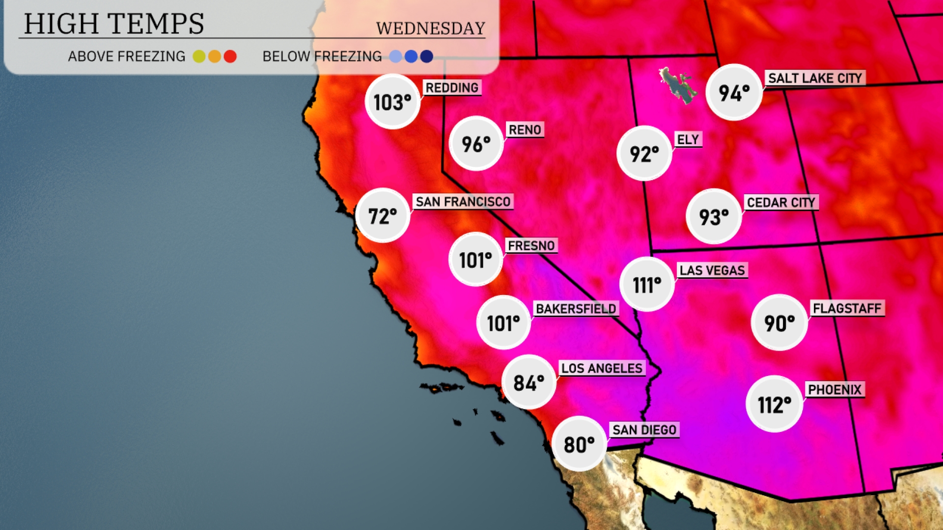 Tomorrow in Phoenix, expect scorching heat with a high of 116 degrees, significantly above average for this time of year. Las Vegas will experience similarly extreme conditions, reaching up to 110 degrees. In Bakersfield, temperatures will soar to 103 degrees, while Fresno is looking at a warm high of 99 degrees. Farther north, Redding will see highs around 96 degrees. San Francisco stays cooler with a high of 63 degrees.
