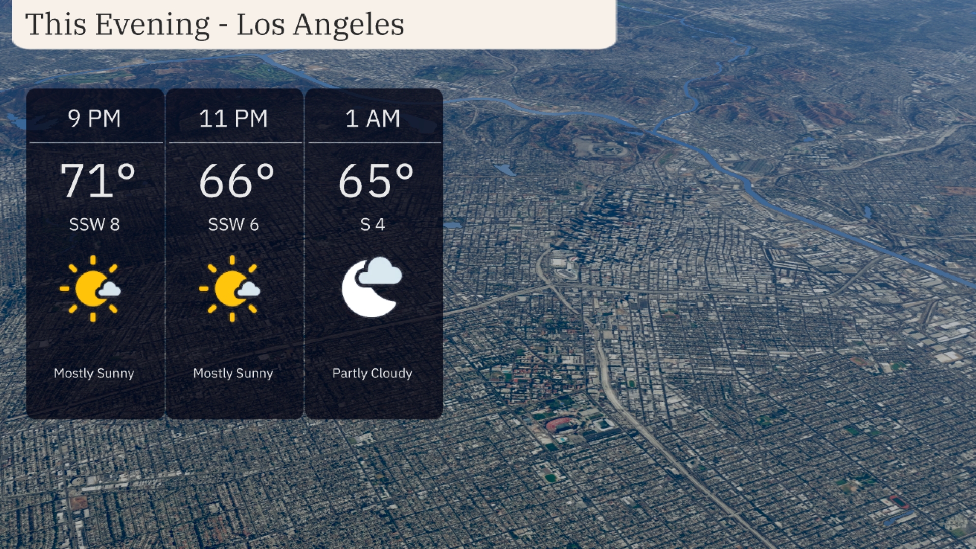 Temperatures in Los Angeles will start at 71 degrees at 9 PM, cooling down to 65 degrees by 1 AM. Expect mostly sunny skies early in the evening, transitioning to partly cloudy conditions. A gentle breeze from the south-southwest at 8 mph early on, becoming calmer overnight with winds shifting to the south at 4 mph. Plan for a comfortable, mild evening overall.