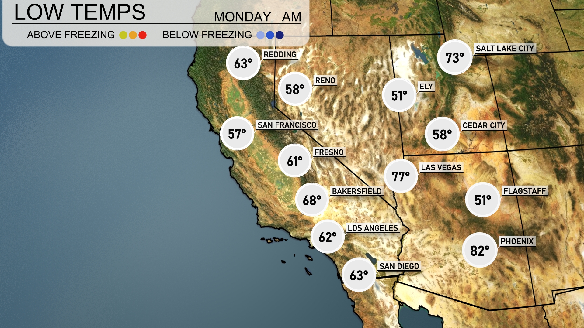 Tonight in the Southwest, Las Vegas will chill down to 77 degrees, while Flagstaff drops to a cool 51. Phoenix will remain warmer at 82 degrees, but nearby, Reno will see a low of 58. Expect farther dips with San Francisco at 57 and Bakersfield cooling to 68.