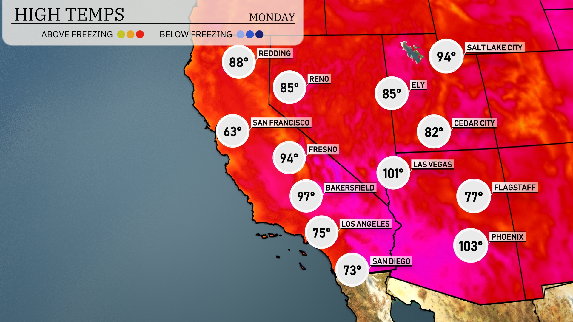 Tomorrow in Las Vegas, expect a sizzling high of 101 degrees, significantly above average for this time of year. Phoenix will be even hotter, reaching a blistering 103 degrees, contributing to ongoing heat advisories in the area. In contrast, San Francisco will remain much cooler at 63 degrees, highlighting the region’s diverse temperature range. Bakersfield and Fresno will see highs of 97 and 94 degrees, respectively, both reflecting a warm summer trend.
