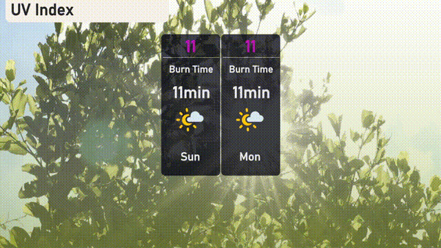 The UV index in Los Angeles is at an extreme level of 11 both on Sunday and Monday, with a very quick burn time of just 11 minutes. With such high UV exposure, it’s crucial to take extra precautions by using sunscreen, wearing hats, and seeking shade frequently.