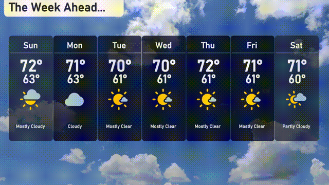 Monday: The week starts with cloudy skies, bringing a high of 71 degrees and a low of 63 degrees.