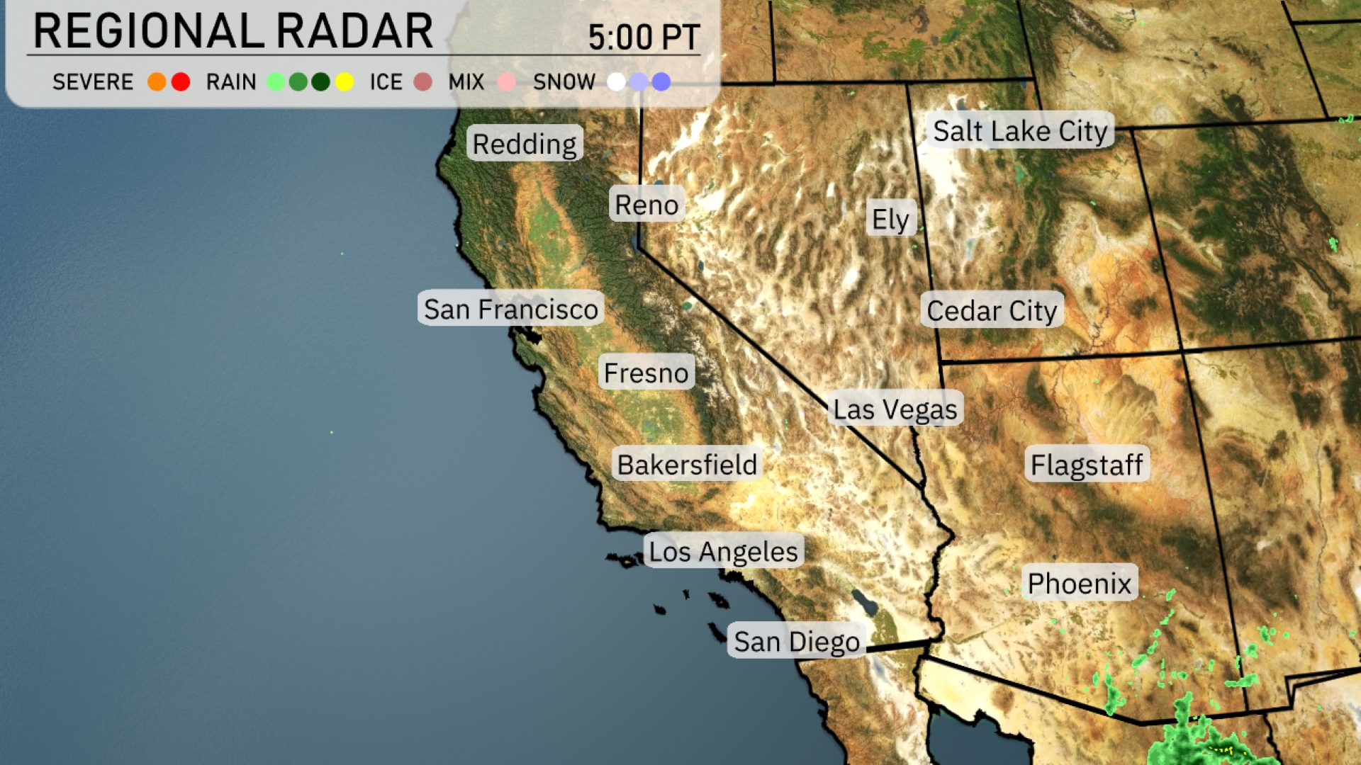 The Southwest is showing a mix of quiet and active weather patterns. Showers near Phoenix move north, affecting Flagstaff with potential rain. Las Vegas and Los Angeles stay dry under clear skies, while San Francisco faces approaching showers near the coast. The Sierra Nevadas near Ely and Cedar City remain calm, though Reno should anticipate some cloud cover soon.