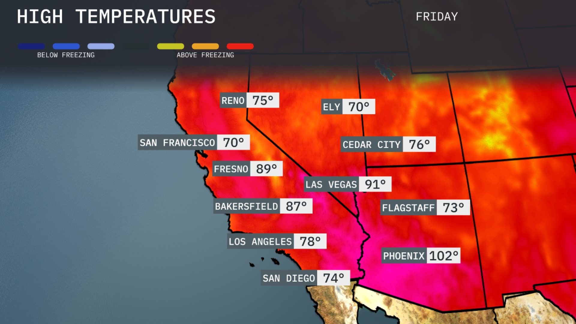 Tomorrow in Phoenix, expect scorching highs around 102 degrees, well above average for this time of year. Las Vegas is also heating up, reaching a high of 91 degrees, making for a hot day in the desert. In Bakersfield, temperatures will climb to 87 degrees, while Fresno bakes under sunny skies at 89 degrees. Coastal areas see a milder 78 degrees in Los Angeles and 74 degrees in San Diego. The Southwest continues to experience above-average temperatures influenced by a persistent high-pressure system.