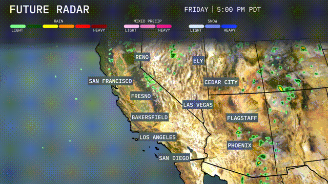 A weather disturbance is heading towards the Southwest, impacting areas like Las Vegas and Ely. Expect showers and isolated thunderstorms starting late Thursday night, extending into Friday afternoon. Rainfall might be moderate in intensity, especially over higher terrains. Temperatures will remain mild, ranging from highs in the low 70s in Cedar City to mid-80s in Las Vegas. Be prepared for occasional gusty winds and slick roads in Northern Arizona and Southern Nevada.