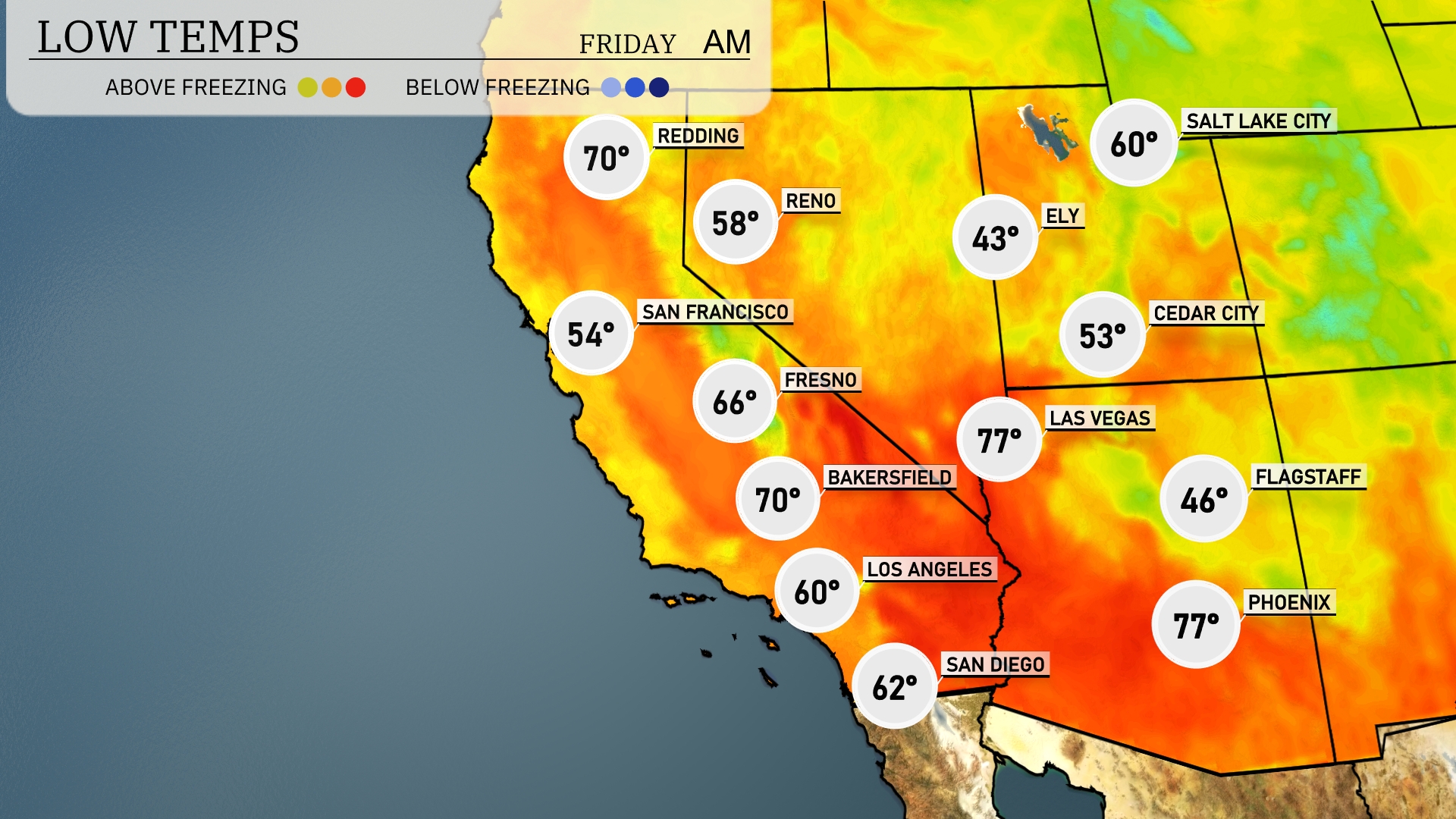Tonight, Flagstaff will experience a cool low of 46 degrees. Las Vegas is expected to drop to 77, while Los Angeles will be a bit cooler at 60 degrees. San Diego will hold steady at 62 degrees. Bakersfield will see a low of 70, and Fresno will drop to 66. Ely will drop to a chilly 43 degrees, marking one of the cooler spots in the region.