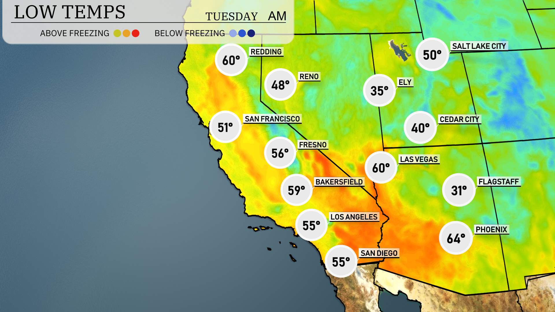 Tonight in the Southwest, expect a significant chill as temperatures drop sharply. Flagstaff will see a low of 31 degrees, while Ely will be even colder at 35. Las Vegas will cool down to 60, with San Diego remaining mild at 55 degrees. Looking at the coast, San Francisco will experience a low of 51 degrees. Bakersfield rounds it out with a low of 59, making for a brisk night across the region.