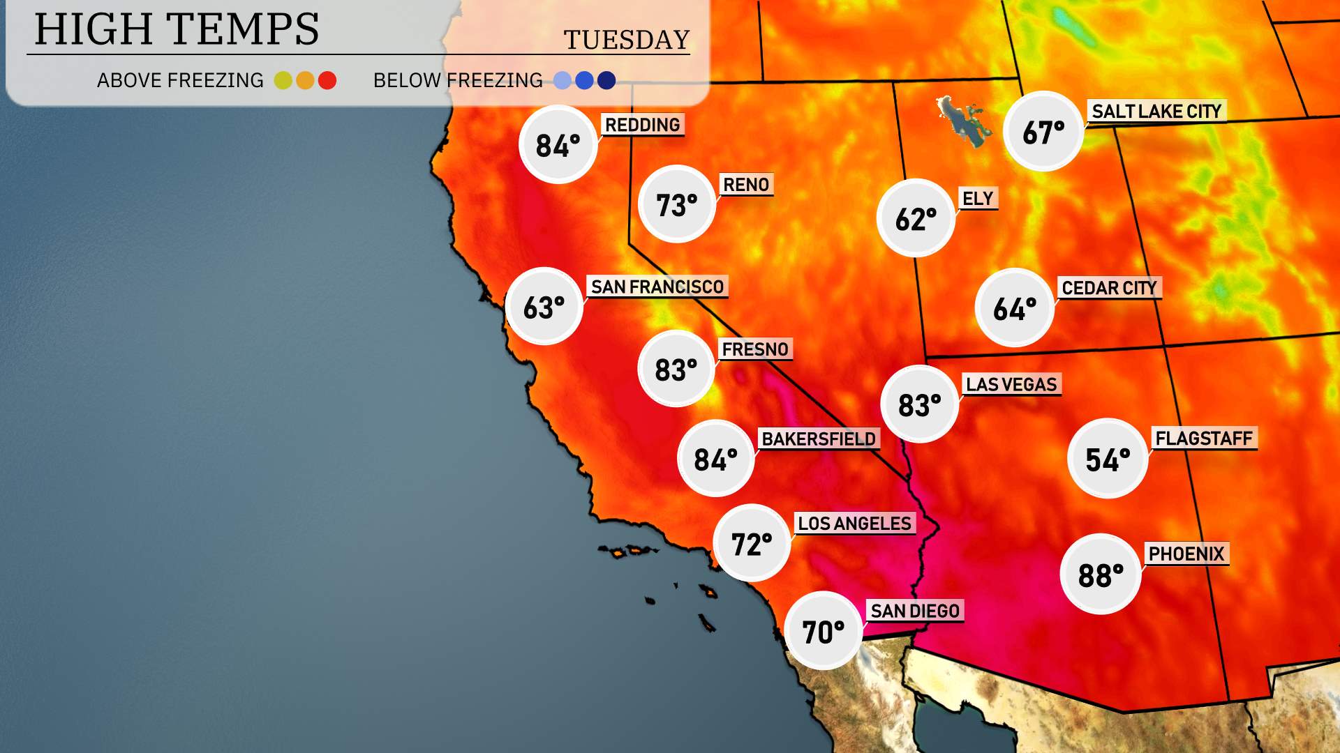 The Southwest is feeling the heat with above-average temperatures expected tomorrow. Phoenix will soar to a high of 88 degrees, while Las Vegas will reach 83. In Bakersfield, temperatures will hit 84 degrees, contributing to warm conditions across California. San Diego remains comfortable at 70 degrees, and Los Angeles is expected to see a high of 72. Cloud cover may provide some relief, but overall, the trend is distinctly warmer for the region.