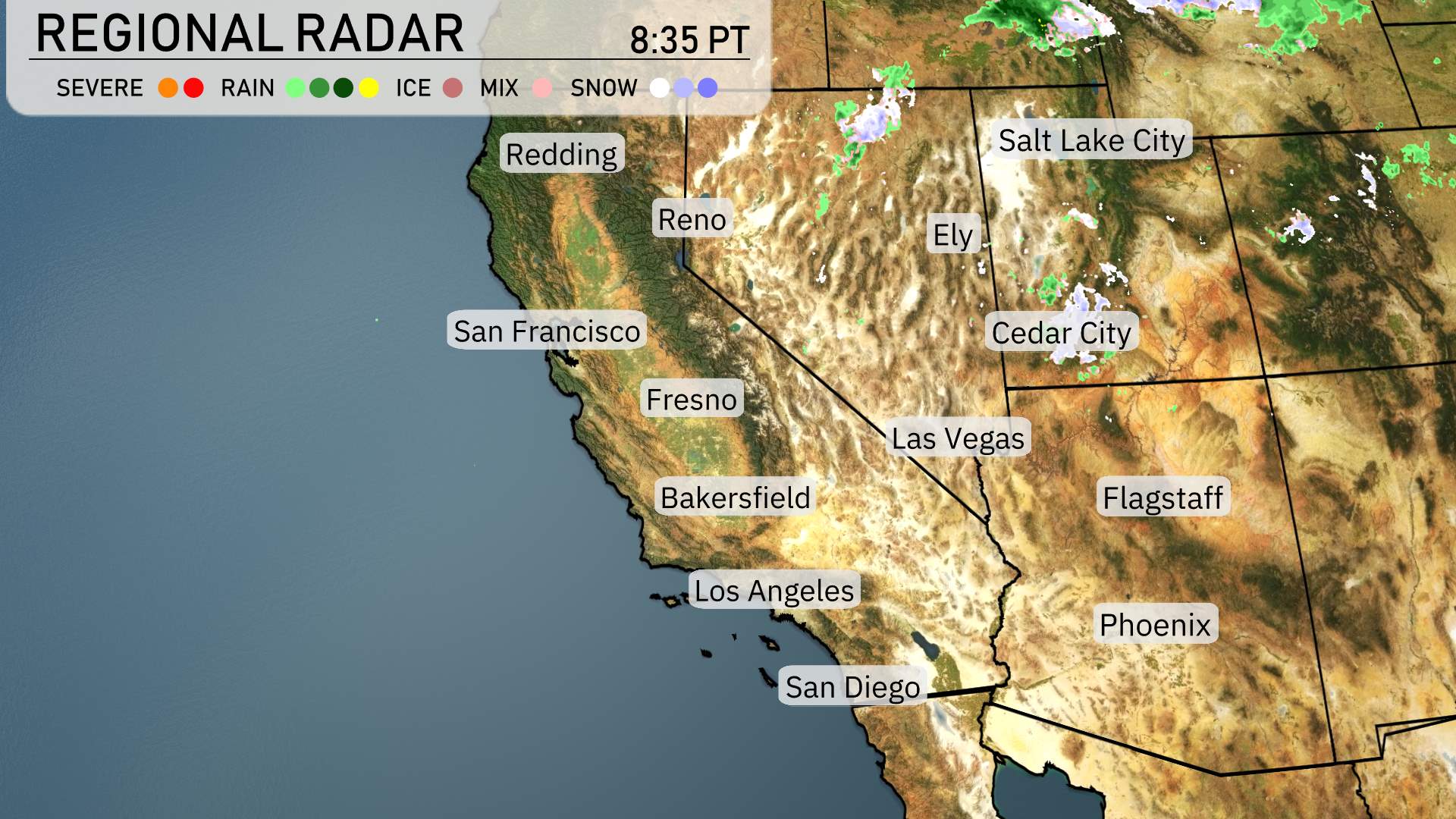 A band of rain showers is moving through Northern California, particularly near Redding, providing relief to the region. Snow is being observed in the higher elevations around Ely, Nevada, while nearby Cedar City is experiencing some storms. Southern California, including cities like Bakersfield and Los Angeles, remains dry and clear at the moment. Light precipitation is seen in the vicinity of Salt Lake City, with conditions expected to persist. The skies are clear over Las Vegas and Phoenix, offering a calm weather break.