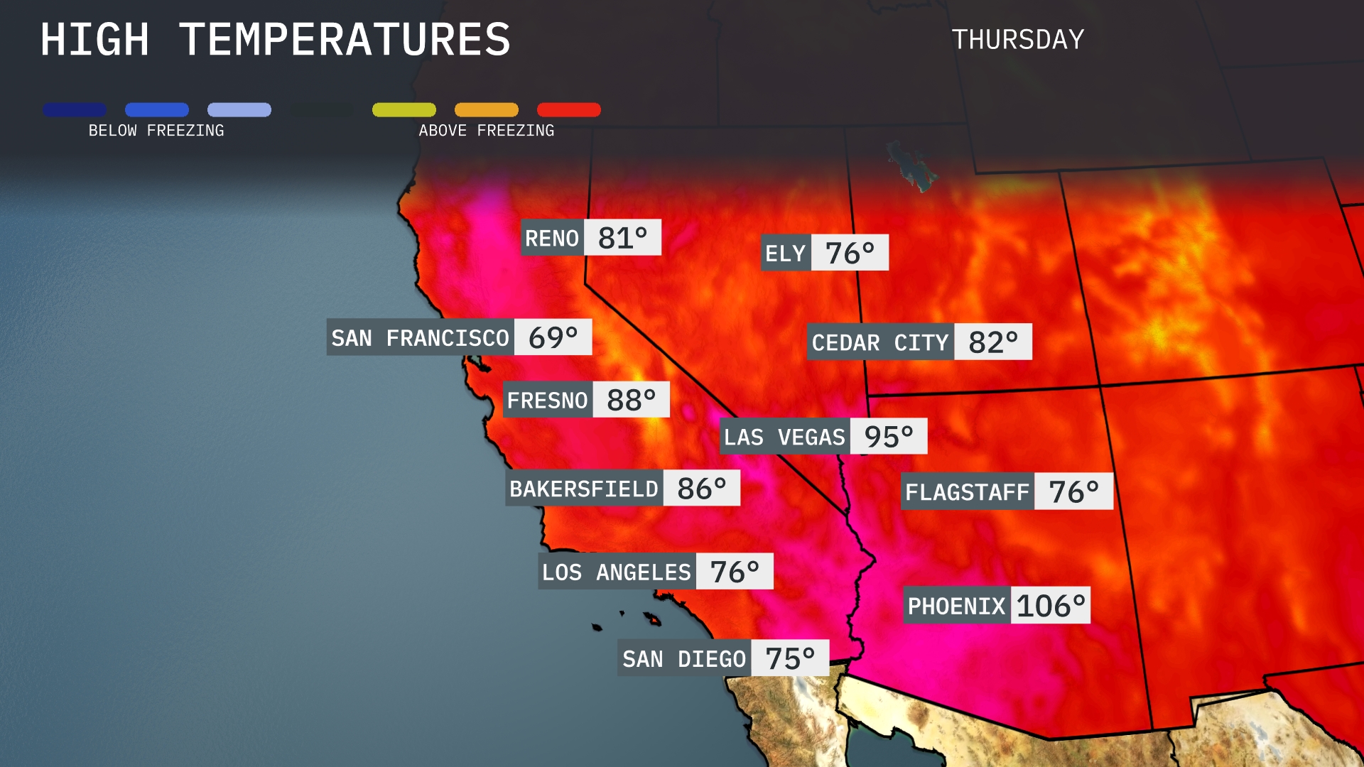 Tomorrow, Phoenix will swelter with a high of 106 degrees, well above average for this time of year. Las Vegas is expected to reach a sizzling 95 degrees, also significantly higher than normal. In California, Fresno will warm up to 88 degrees, while Bakersfield will see a high of 86. The coastal areas will be a bit cooler, with Los Angeles reaching 76 degrees and San Diego at 75. Overall, the Southwest is experiencing a notable heat spike due to a persistent high-pressure system dominating the region.