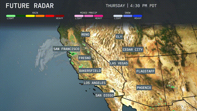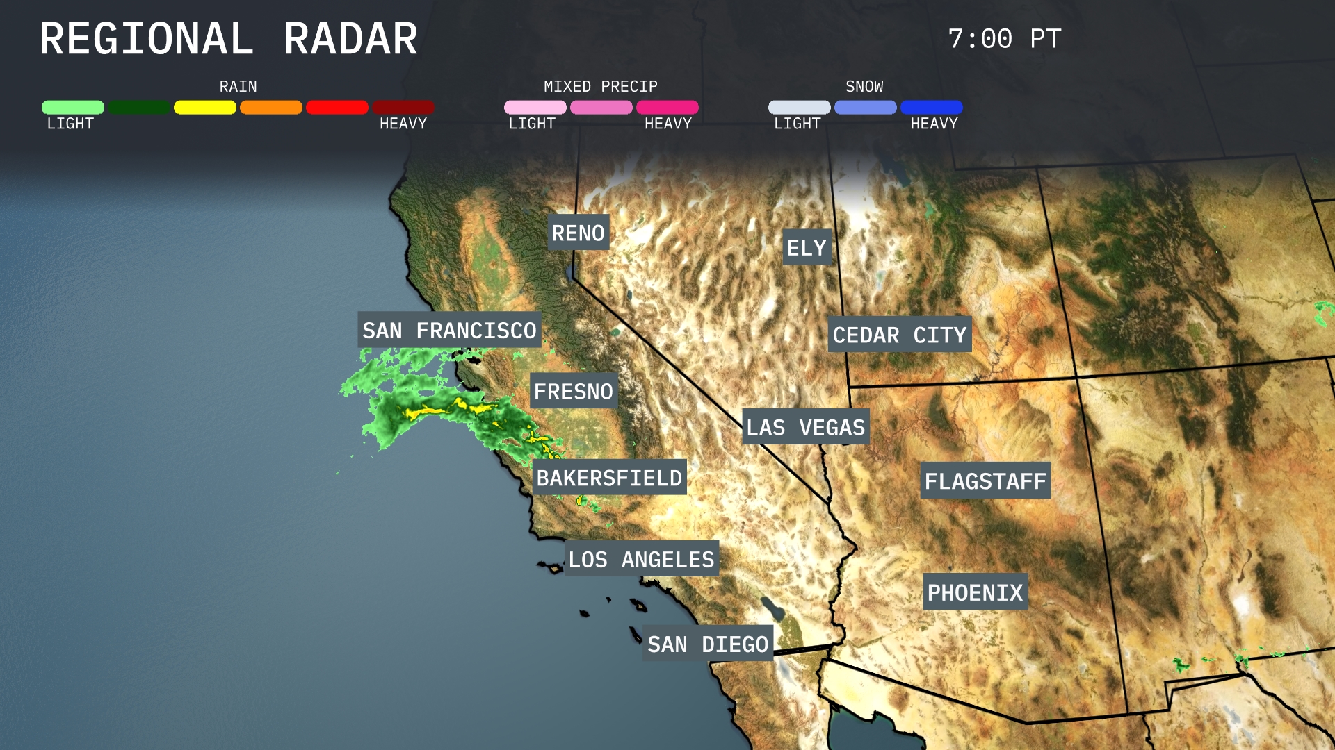 A strong system is moving into the Southwest, with the radar showing rain sweeping across the California coast from San Francisco to Los Angeles. Areas like Fresno and Bakersfield are seeing moderate rain showers. Cedar City remains clear, while the skies around Las Vegas also stay dry. For Flagstaff and Phoenix, conditions appear calm with clear skies prevailing.