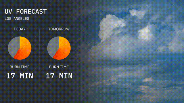 Today in Los Angeles, the UV index is high at 8, resulting in a burn time of about 17 minutes in direct sunlight. It remains unchanged for tomorrow, with the UV index staying at 8 and a similar rapid burn time of just 17 minutes. Keep your sunscreen and protective clothing handy!