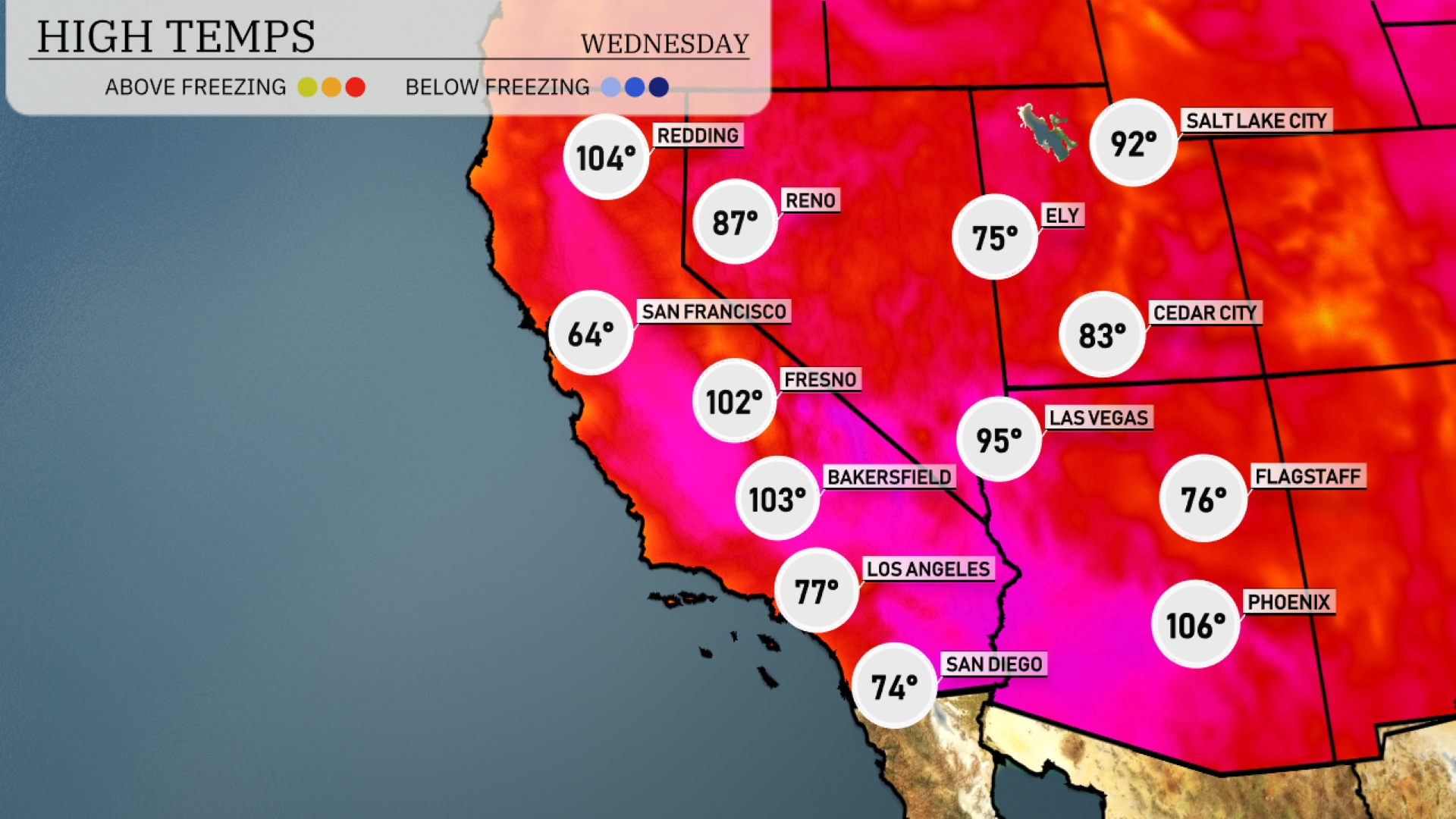 Tomorrow in Phoenix, expect a high of 101 degrees, continuing a trend of above-average temperatures. Las Vegas will reach 100 degrees, showcasing the typical summer heat for the region. Bakersfield is set to soar to 104 degrees, slightly above seasonal norms. Los Angeles will enjoy a more moderate high of 78 degrees. San Diego will be cooler at 75 degrees, providing a respite from the intense heat inland.