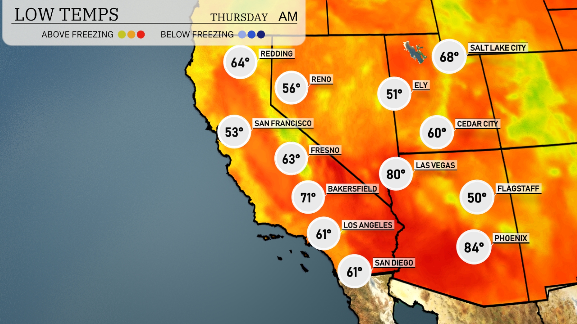 Tonight expect a chilly 50 degrees in Flagstaff, while Ely will see a low of 51. Las Vegas remains relatively warm at 60, but Los Angeles cools down to 61 degrees. Phoenix will wrap up the night at 84.
