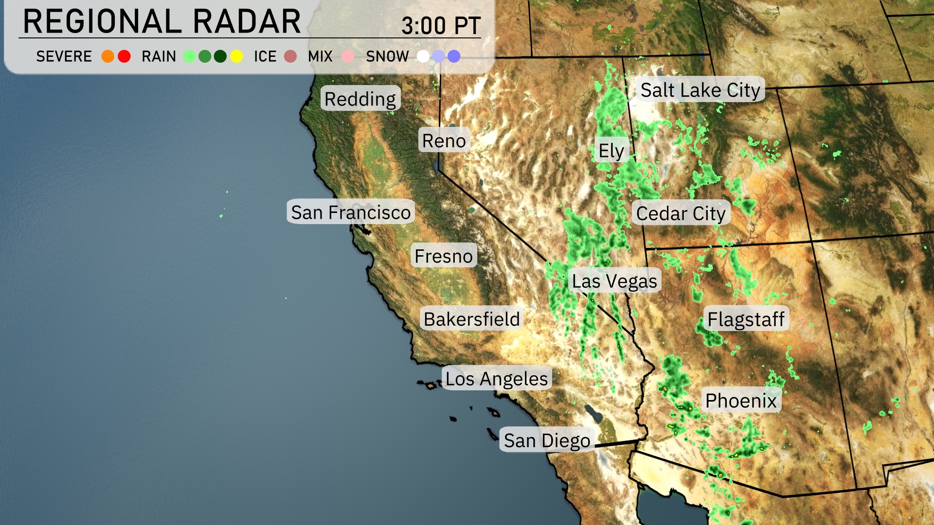 Clouds are impacting areas from Ely to Cedar City, while overcast conditions extend southeast towards Flagstaff. San Francisco and Los Angeles remain dry, with clear conditions prevailing along much of the California coast. Phoenix is currently experiencing light rain, and clouds are building across the Arizona deserts. The Silver State, especially around the Las Vegas area, shows little-to-no precipitation on the radar.