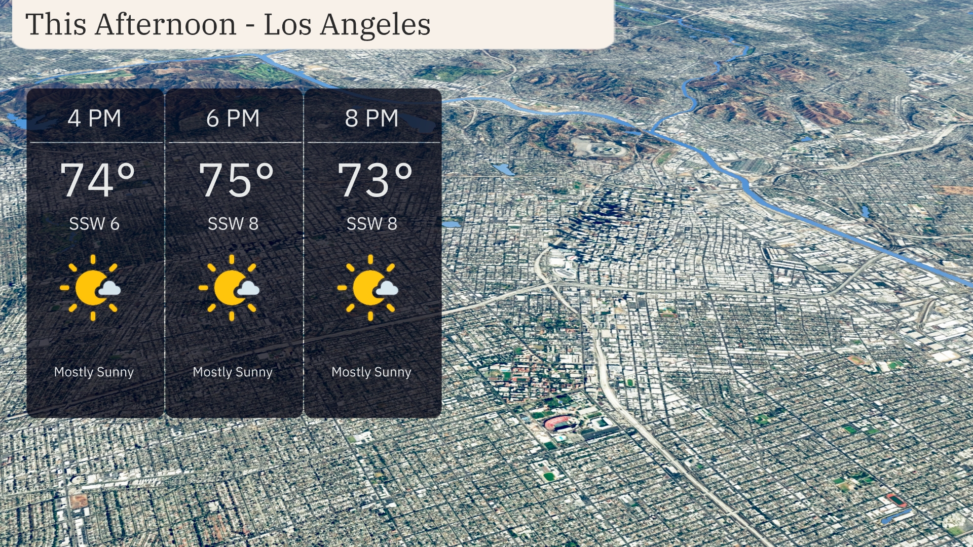Temperatures in Los Angeles this afternoon rise to the mid-70s, peaking at 75 degrees around 6 PM. Expect mostly sunny skies with a gentle southwest wind ranging from 6 to 8 miles per hour. Overall, the weather remains pleasantly warm and inviting for any outdoor plans.