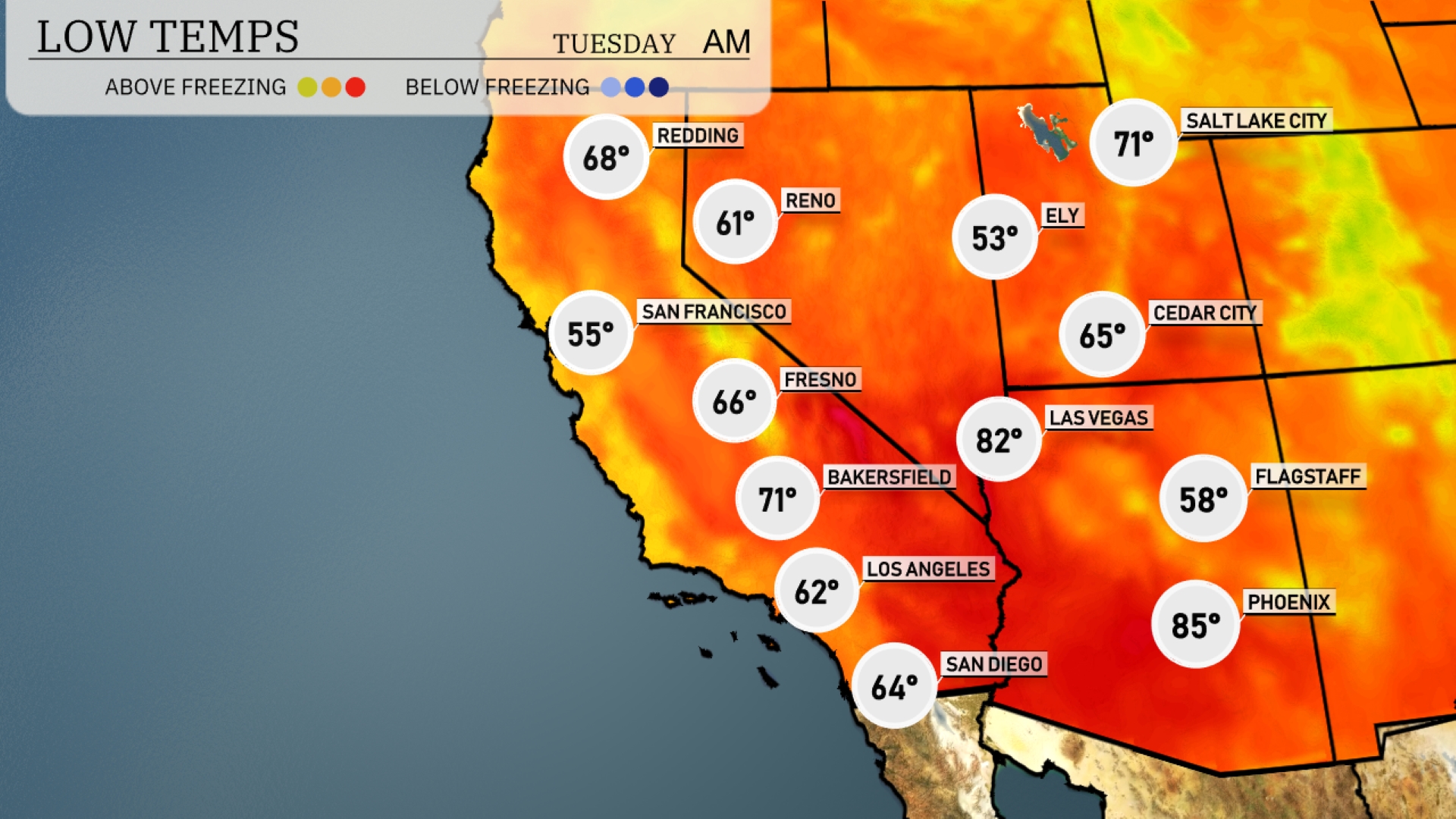 Tonight, temperatures in the Southwest will be quite varied, with Las Vegas dropping to 62 degrees. Phoenix won’t stray far, settling at 67 degrees. Further north, Flagstaff will see a cooler low of 53 degrees, while San Diego remains mild at 64 degrees. Expect temperatures in Fresno to cool to about 66 degrees as well.