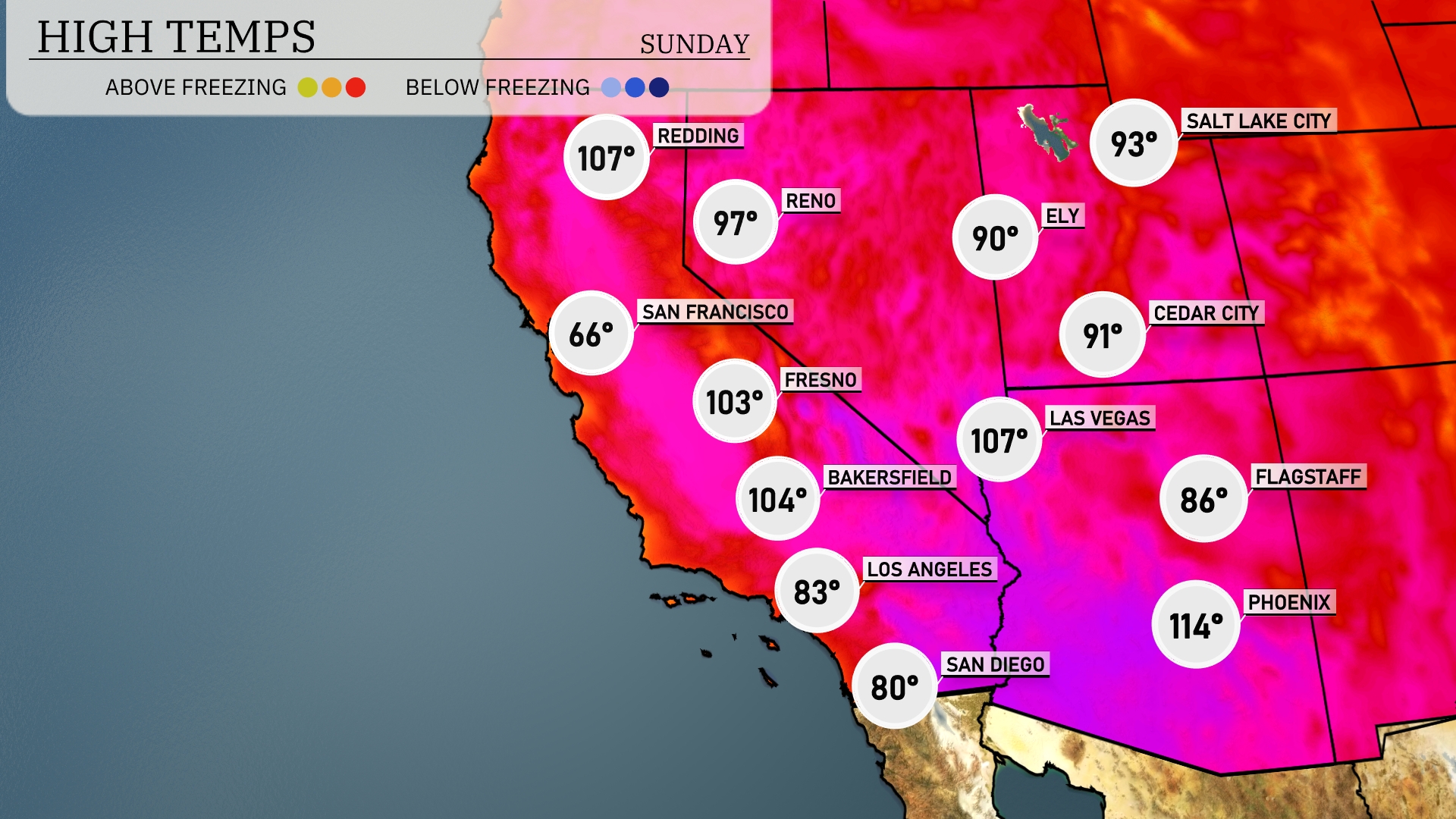 Today’s regional high temperatures in the Southwest are sizzling. In Phoenix, expect a scorching high of 114 degrees, while Las Vegas will reach 107. Fresno is also heating up with a high of 103 degrees. Bakersfield won’t be far behind at 104 degrees, and San Diego is a bit cooler at 80. The sharp contrast in temperatures highlights the intense heat wave affecting the region today.