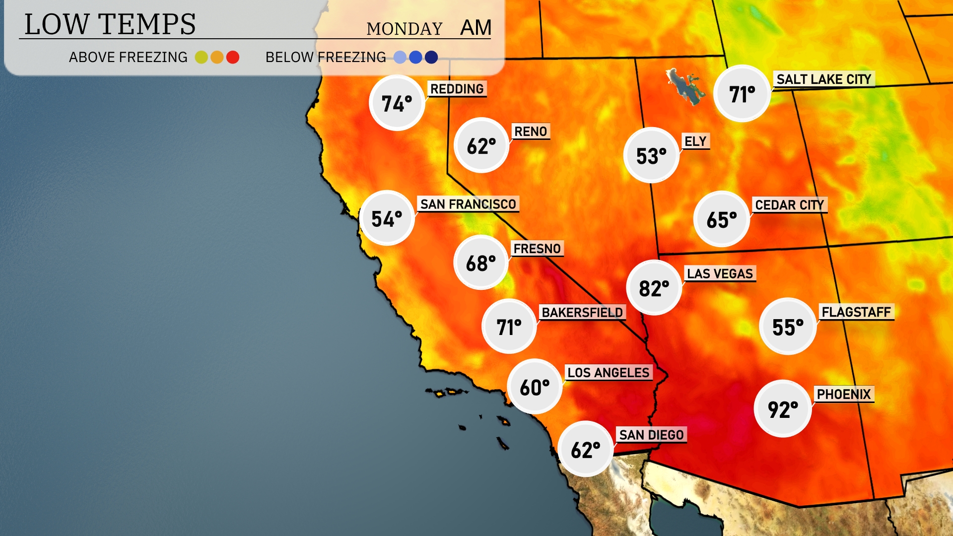 Tonight, temperatures will drop significantly across the Southwest. Las Vegas is expected to see a low of 82 degrees, while Flagstaff will cooler at 55. In California, Los Angeles will drop to 60 degrees, with San Francisco hitting a brisk 54. Expect a mild night for San Diego at 62 degrees.