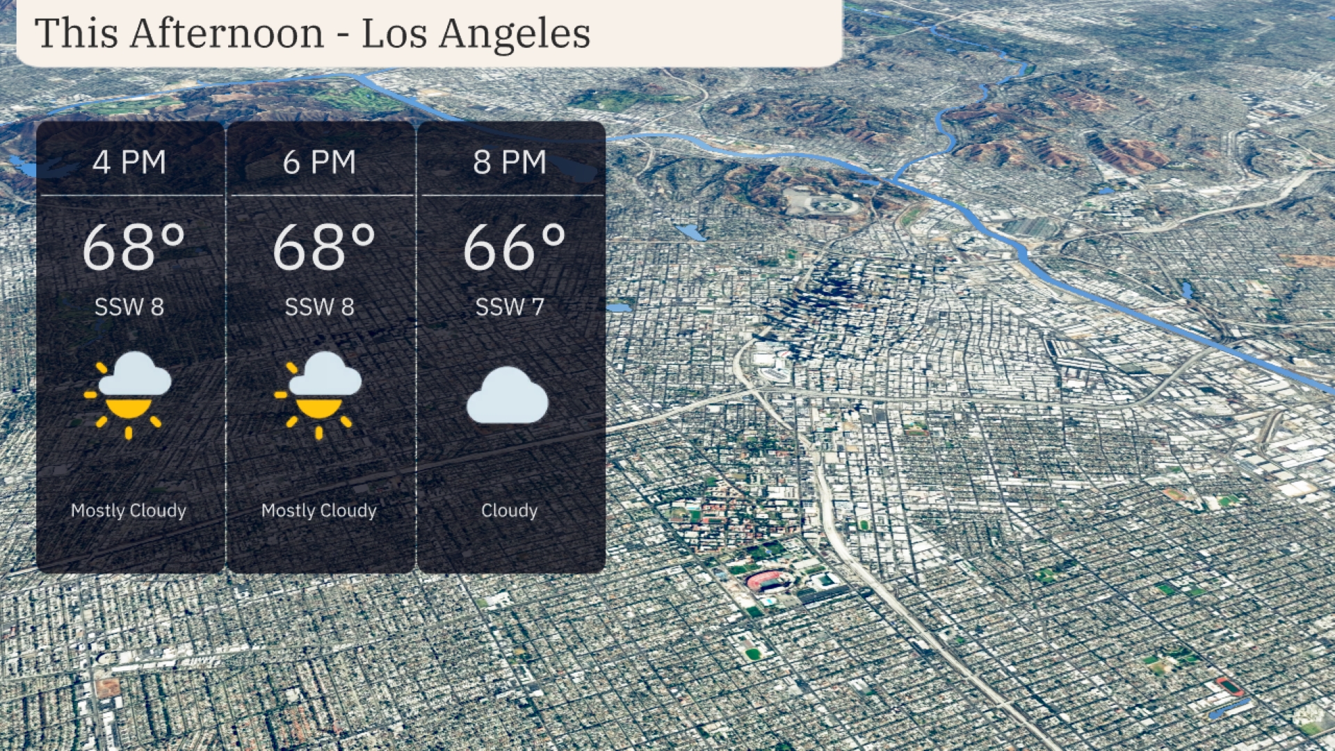This afternoon in Los Angeles, temperatures reach 68 degrees under mostly cloudy skies with a light breeze from the south-southwest at 8 miles per hour. By 6 PM, expect consistent conditions with temperatures holding steady at 68 degrees. As the evening progresses, clouds remain dominant with temperatures slightly dropping to 66 degrees by 8 PM, and winds calming to 7 miles per hour.