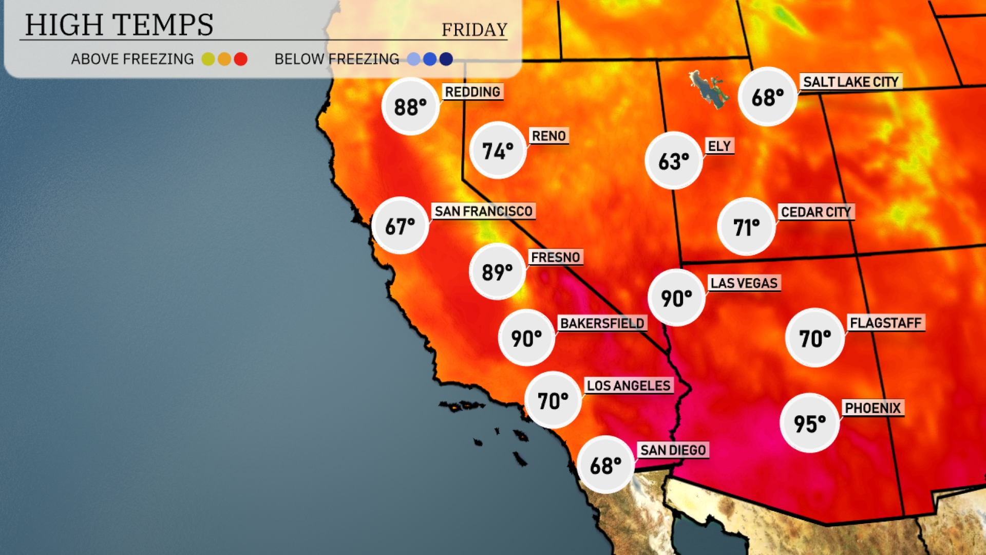 High temperatures in the Southwest tomorrow will trend higher than average, with Phoenix soaring to a sizzling 94 degrees. Las Vegas is set to reach a warm 86 degrees, while Bakersfield will experience a comfortable high of 81 degrees. Los Angeles, staying cooler near the coast, will see temperatures around 64 degrees. Farther north, Fresno will warm up to 77 degrees, with San Francisco hitting 63 degrees.