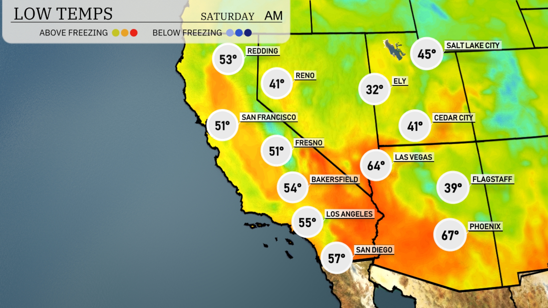 Tonight Flagstaff will dip down to a brisk 39 degrees, while Ely is forecasted to hit the freezing mark at 32 degrees. Las Vegas remains mild, with a low of 64 degrees, but it’s still a noticeable drop from earlier this week. In contrast, Phoenix will stay warm at 67 degrees. Expect San Diego to cool to a comfortable 57 degrees, as the coastal influence moderates the chill in Southern California.