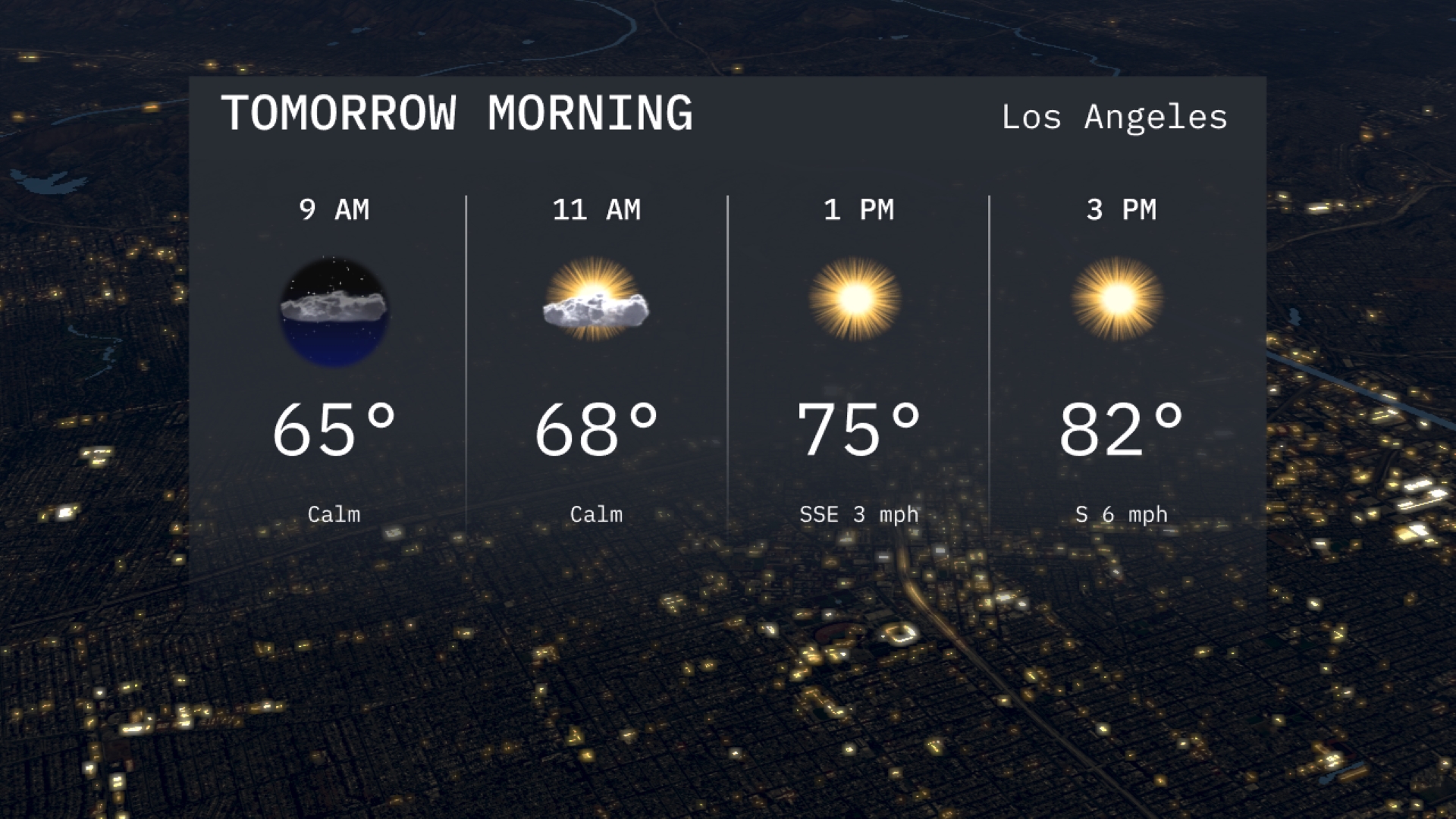 Tomorrow morning in Los Angeles begins with a calm and mild weather pattern, featuring temperatures starting at 65 degrees at 9 AM. By 11 AM, expect a gradual warming with temperatures reaching 68 degrees under partly cloudy skies.