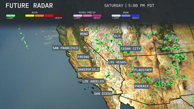 A band of storms is moving across northeastern Arizona, affecting areas around Flagstaff with rain and potentially some gusty winds. The weather is more settled in Las Vegas, remaining dry and warm, whereas Cedar City may encounter some light showers. A mix of precipitation is observed moving into southern California, particularly impacting areas near San Diego. San Francisco and areas farther north appear to be enjoying clearer skies, with no significant weather systems noted.