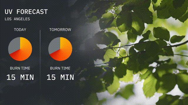 The UV index for Los Angeles today is at a high level, reaching 8, with potential sun exposure leading to burns in just 15 minutes. For tomorrow, the UV index remains equally strong at 8, so make sure to wear sunscreen and protective gear as burns can also occur in 15 minutes.
