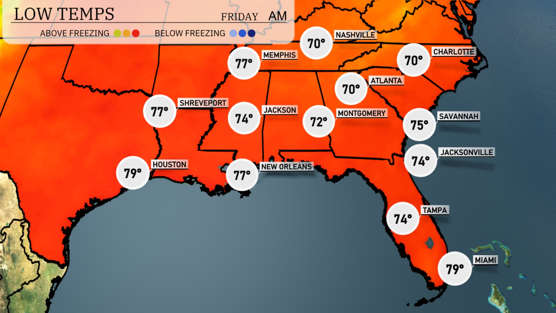 Tonight, temperatures in Memphis will dip to 77 degrees. Nashville will enjoy a mild low of 70, while Atlanta cools down to 70 as well. Expect Jacksonville to settle at 74 degrees and Tampa at 74 as well.