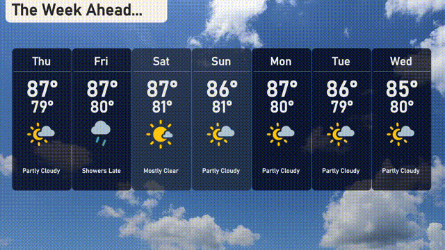 Thursday: Partly cloudy with a high of 87 degrees and a low of 79 degrees.