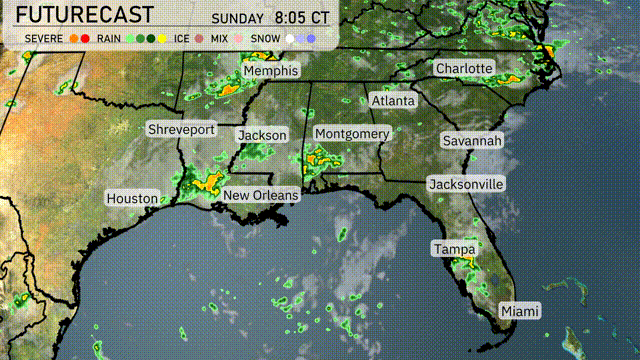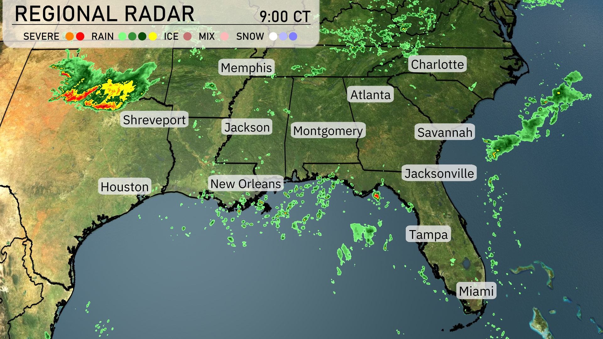 A cold front is making its way through the Southeast, bringing active weather conditions. Expect thunderstorms across Louisiana and Mississippi, moving toward Alabama by tomorrow. Areas from Houston to Shreveport should prepare for strong storms and heavy rain potential tonight. Showers extend from Montgomery to Charlotte, impacting morning commutes. Temperatures behind the front will be cooler, but expect a return to dry skies by late Wednesday.
