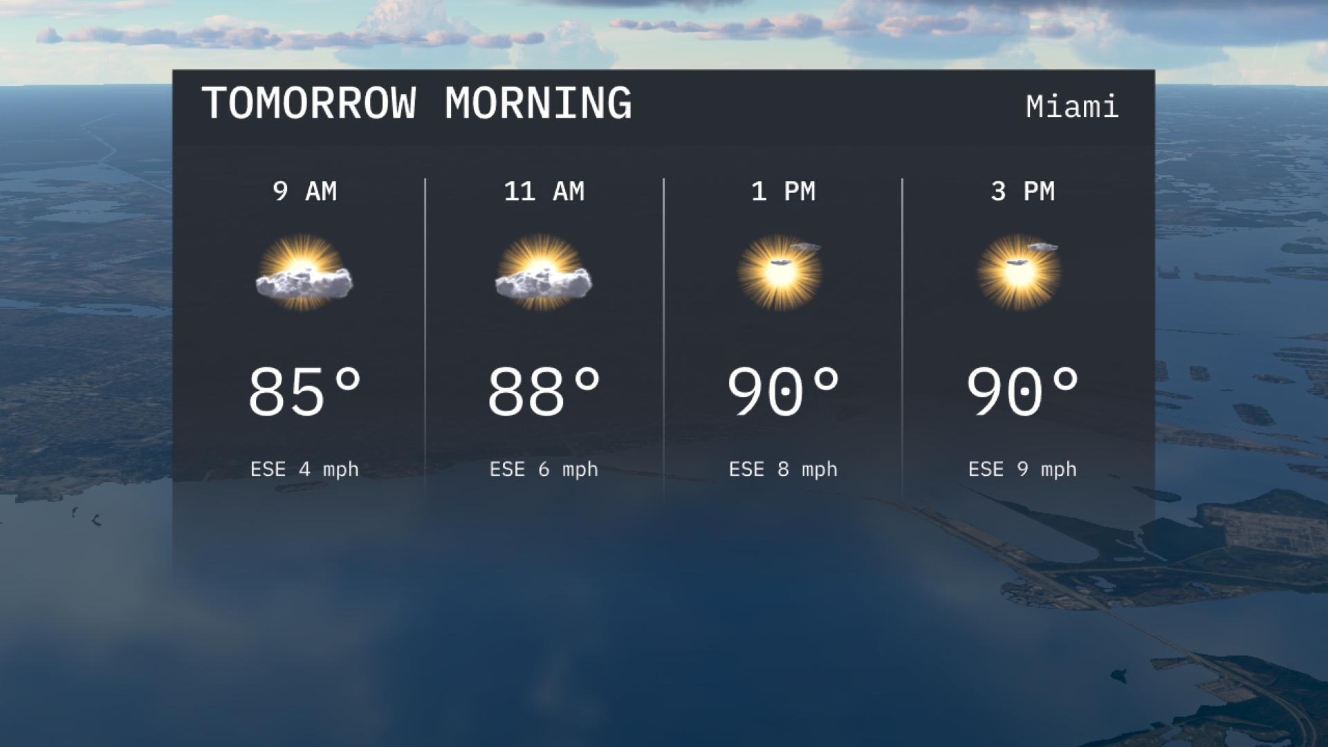 A steamy start for Miami with temperatures climbing from 85 degrees at 9 AM to 88 degrees by 11 AM. Expect partly cloudy skies transitioning to more sunshine as the morning progresses. Winds will be from the east-southeast around 4 to 6 mph, offering just a gentle breeze.