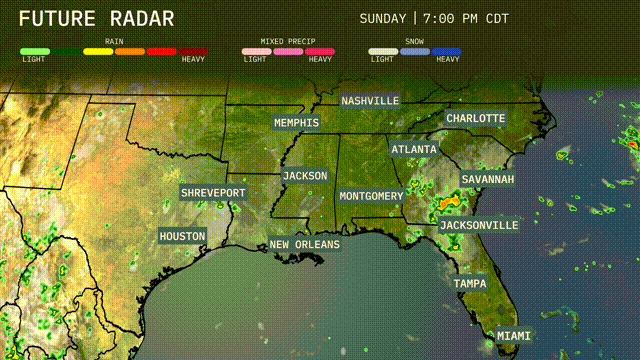 Tomorrow, Atlanta reaches a high of 72 degrees, while Montgomery will be slightly warmer at 74. Memphis will see a high of 77 degrees, showcasing above-average warmth for this time of year. New Orleans is set to enjoy 79 degrees, with Houston topping out at 80, also above normal. Jacksonville rounds out the forecasts with a high of 77 degrees, providing a warmend welcome for the Southeast.