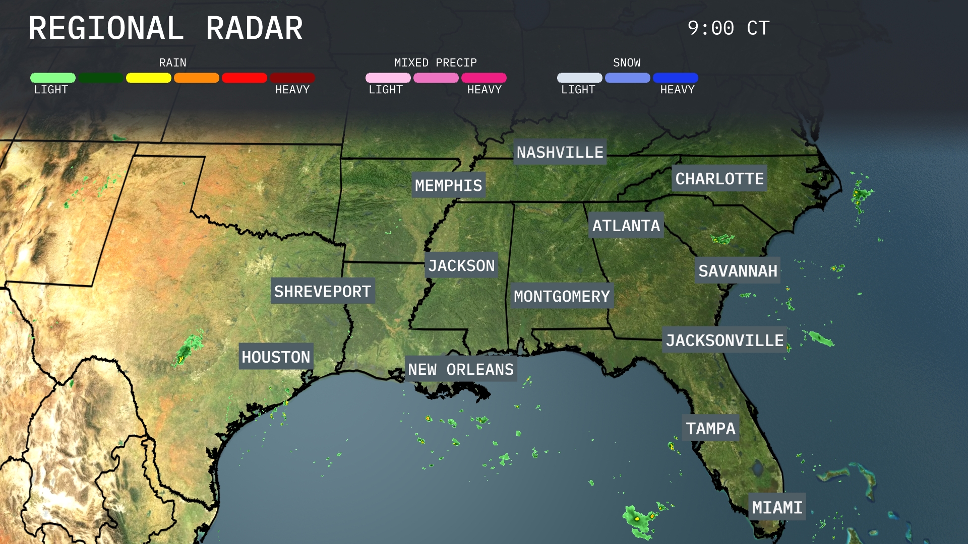 A calm start in the Southeast with some light rain showers making their way over the Gulf of Mexico towards New Orleans. Over in eastern Texas, near Houston, a few isolated light showers are detected moving eastward. The rest of the region including Memphis, Nashville, and across to the Carolinas remains predominantly clear and warm, providing a pleasant day ahead. Scattered clouds are poised to build up over Florida, especially around Miami.