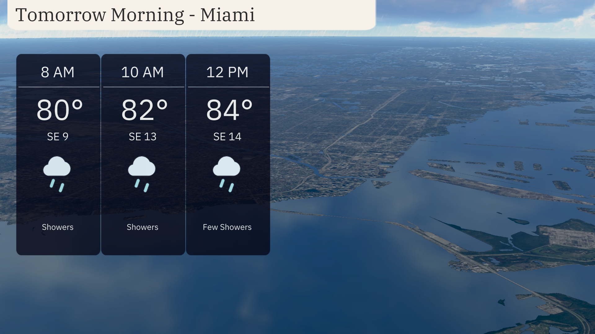 Tomorrow morning in Miami, temperatures begin at 80 degrees around 8 AM, edging up to 84 degrees by noon. Showers are expected throughout the morning with a southeast wind ranging from 9 to 14 miles per hour. Cloud cover remains consistent with opportunities for rain until the late morning hours.