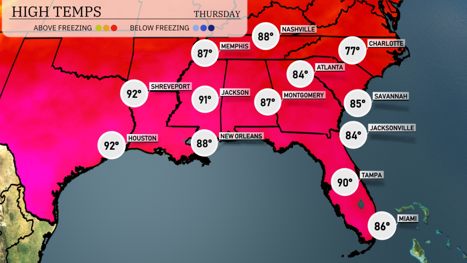 Tomorrow, temperatures soar across the Southeast, with highs reaching 92 degrees in both Houston and Shreveport. Jackson is expected to be warm at 91 degrees, while New Orleans will see a high of 88. Atlanta warms up to 84 degrees, and farther south, Tampa is set for a high of 90 degrees.