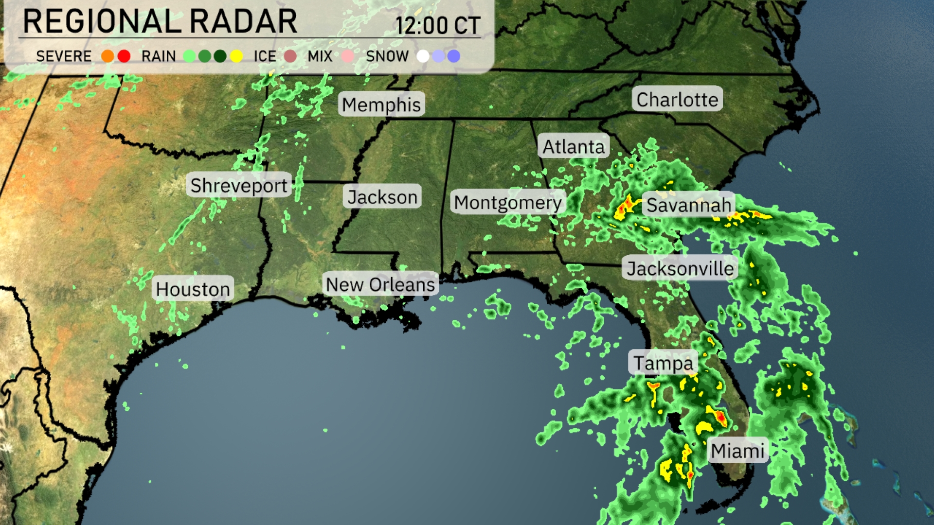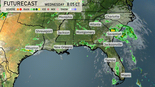 A swath of rain is sweeping across the Southeast, with heavy showers extending from Tampa towards Jacksonville. The radar shows a defined line of rain stretching along the Gulf Coast from New Orleans, moving northeast towards Montgomery and Atlanta. Savannah is experiencing moderate rainfall that is likely to persist as the storm moves further inland. Charlotte and much of the Carolinas remain under overcast skies with potential for rain later in the day. Memphis and Shreveport are seeing mostly clear skies, offering a respite from the wet conditions.