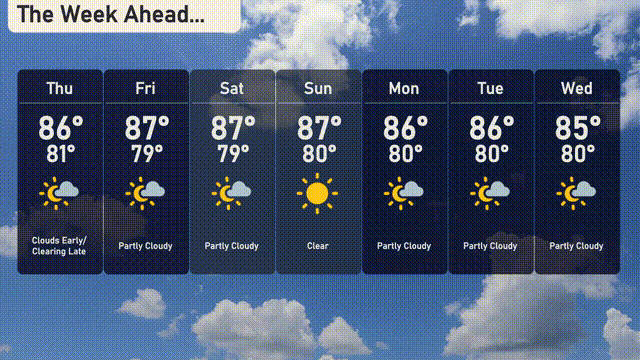 For the 7 Day Outlook in Miami: Thursday: Clouds early, clearing late with temperatures peaking at 86 degrees and a low of 81 degrees. Friday: Partly cloudy skies, a high of 87 degrees, and temperatures dropping to 79 degrees at night. Saturday: Expect partly cloudy conditions with a high of 87 degrees and a low of 79 degrees. Sunday: Clear skies with a high of 87 degrees and nighttime temperatures around 80 degrees. Monday: Partly cloudy with highs reaching 86 degrees and lows near 80 degrees. Tuesday: Enjoy partly cloudy weather with a high of 86 degrees and a low of 80 degrees. Wednesday: Partly cloudy skies continue with temperatures rising to 85 degrees, cooling down to 80 degrees overnight.